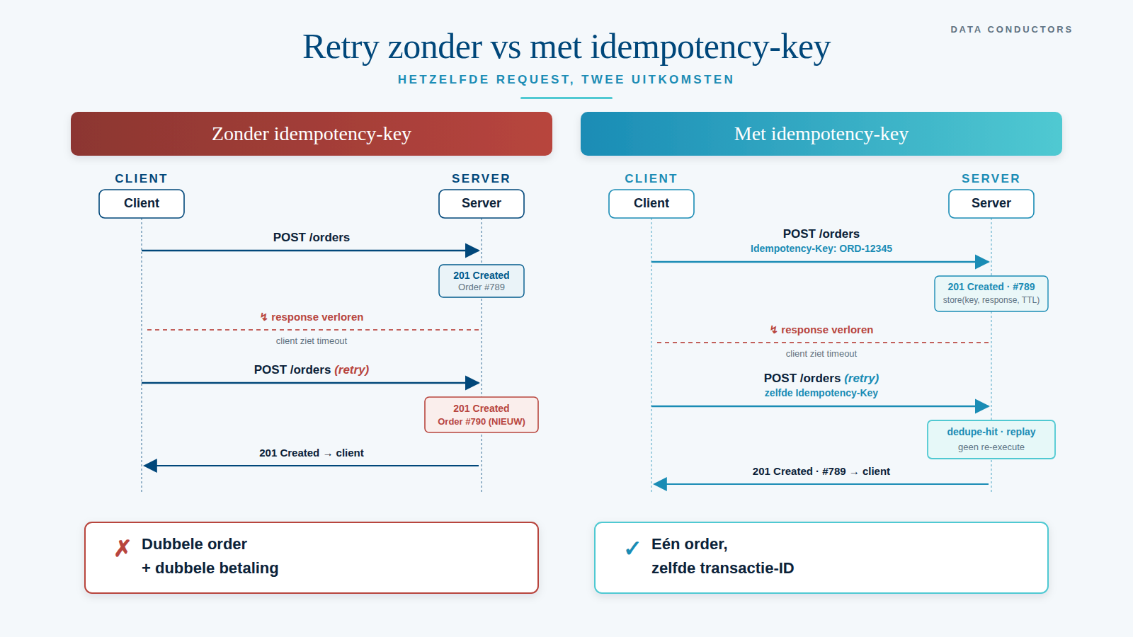 Wat retries níét oplossen — en juist verergeren — is het scenario waarin de eerste poging in werkelijkheid wél geslaagd is, maar het antwoord onderweg verloren ging. De server heeft de transactie verwerkt; de client zag alleen een timeout. De client probeert opnieuw. De server, die geen idee heeft dat dit een herhaling is, voert dezelfde mutatie nog eens uit.